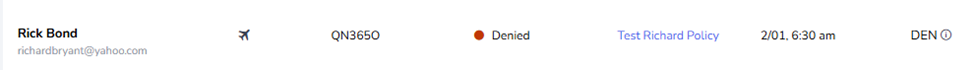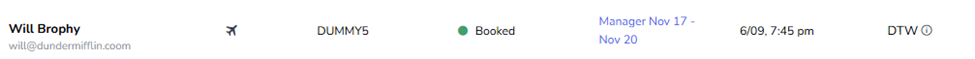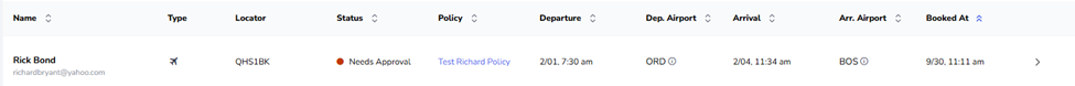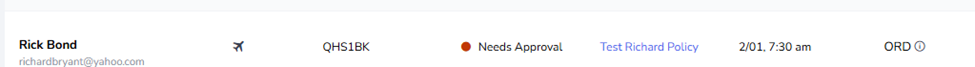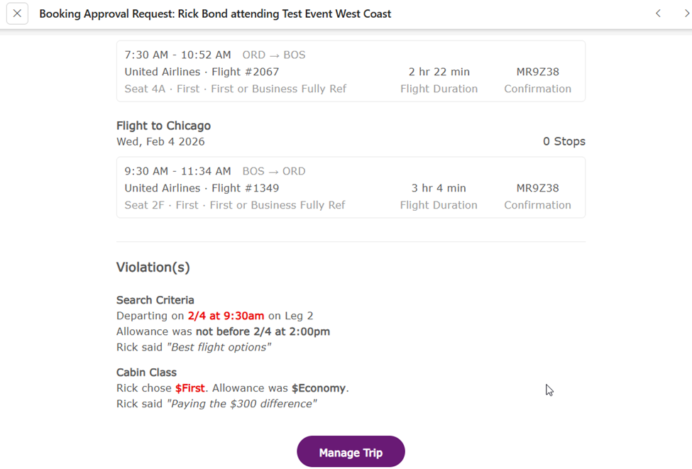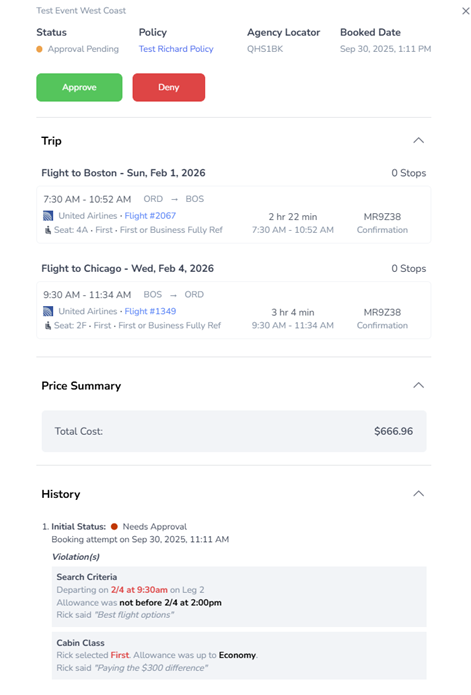 6. Once in the dashboard, clicking on the Trip Details will display the trip, the Approve or Deny button and the reason the traveler chose the flights