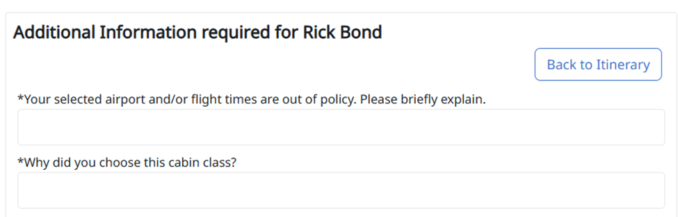 1. Traveler makes reservation, if Policy is violated, traveler will be required to input reason why