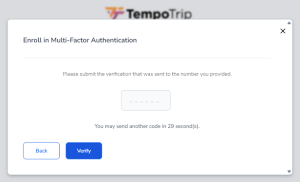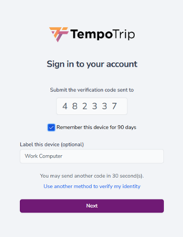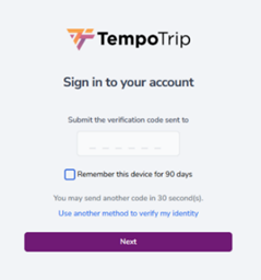 The next time you log into your TempoTrip account, you will be prompted to enter your username, password, and the verification code.