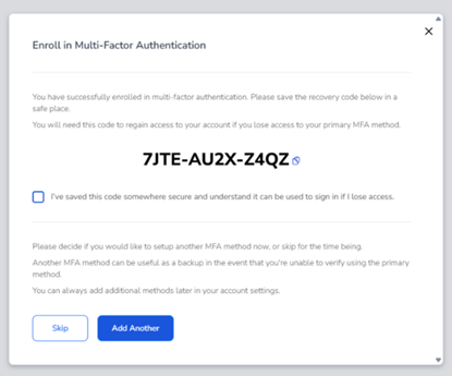 After verification, you will receive a Recovery Code. It’s crucial to save this code in a secure location that you will remember. This code will help you recover access to your account if you lose access to your MFA methods.
