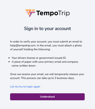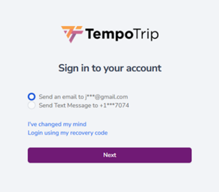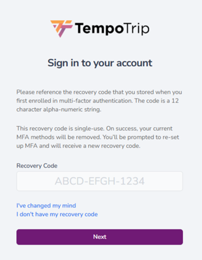 If you are unable to use your text or email methods and do not have your recovery code, click on I don’t have my recovery code. You will then see a prompt that allows you to either try again or provide the requested information to email help@tempotrip.com for assistance.