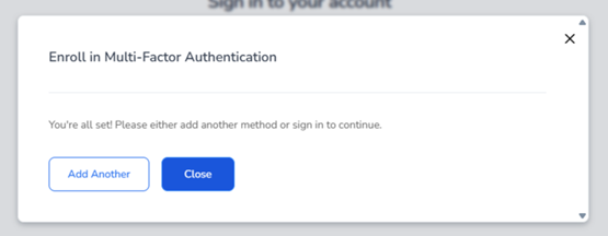 If you wish to add another MFA method, click on Add Another. For example, if you initially added Text/SMS and now want to add Email, you can do so here. If you prefer to skip adding another method, simply click on Skip.