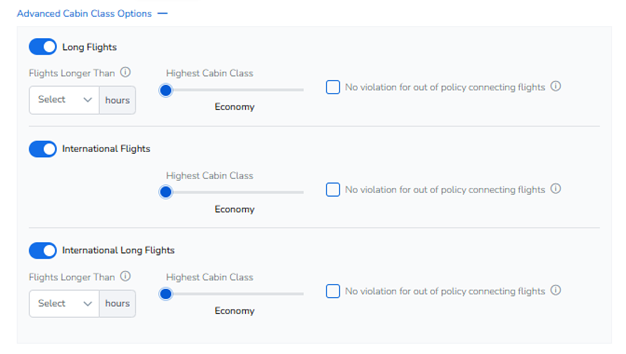 The checkbox labeled “No violation for out of policy connecting flights” allows for exceptions for shorter legs within a longer itinerary. By default, each individual flight segment is evaluated on its own. This means that even if the total trip is long, each leg must meet the policy requirements.