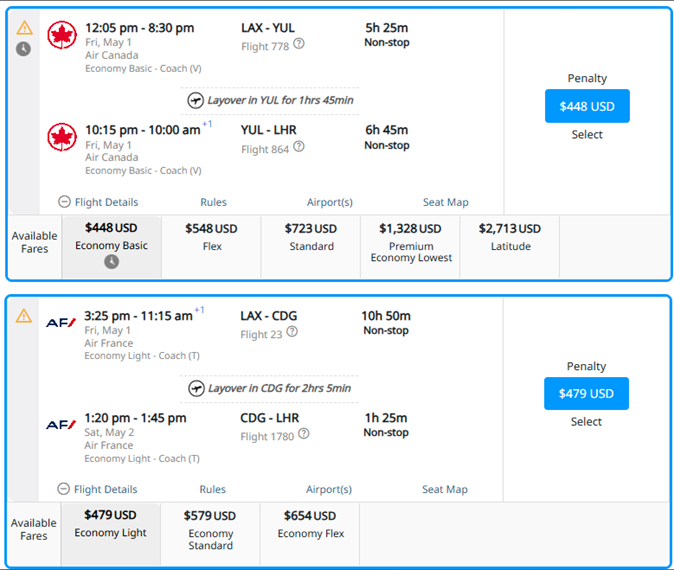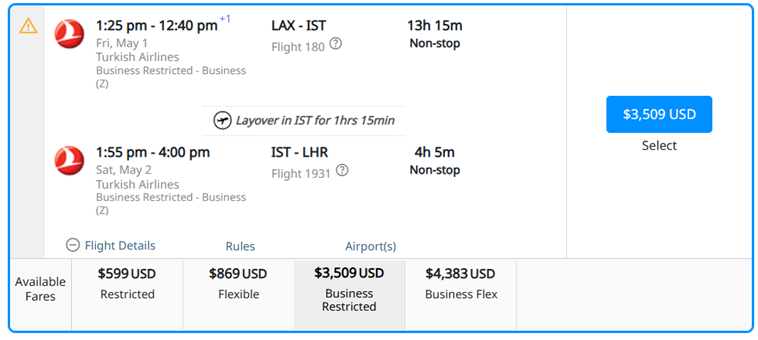 On the other hand, the flight connection option below would be in policy for Business Class since one flight, from Los Angeles to Istanbul, exceeds 12 hours: