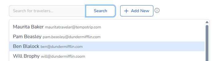 To invite travelers who already have profiles, type their name in the search box and click "Search." Alternatively, you can click "Search" without any input in the search box to view all profiles. Select the desired name to add them to the list, and repeat as necessary.
