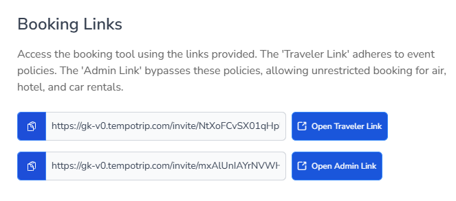 Admin Link: This option bypasses all policy enforcement and allows booking car and hotel accommodations in addition to air travel. The Admin Link is typically utilized for VIP, C-Suite, or white-glove service bookings.