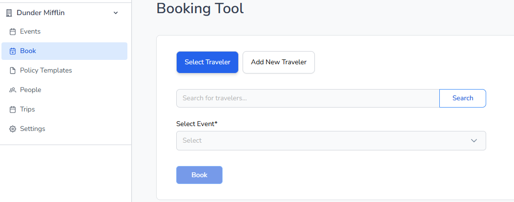 The Admin User can book a traveler using a simplified method that bypasses the traditional navigation through Event, Policy, invite, select traveler, and then booking. This process is designed to enhance efficiency and user experience.